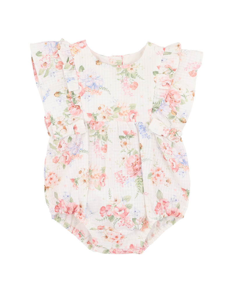 Soft, sweet, and beautifully detailed, the Anya Woven Bodysuit is a charming choice for special moments or everyday elegance. Crafted from lightweight, breathable cotton, it features a vintage-inspired bloom print in delicate pinks, corals, and blues on an ivory base. The flutter sleeves with soft ruffle detail and gently gathered bodice create a timeless silhouette, while snap leg openings and a back button closure make dressing easy.