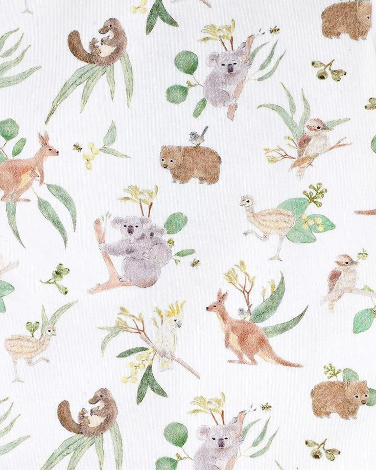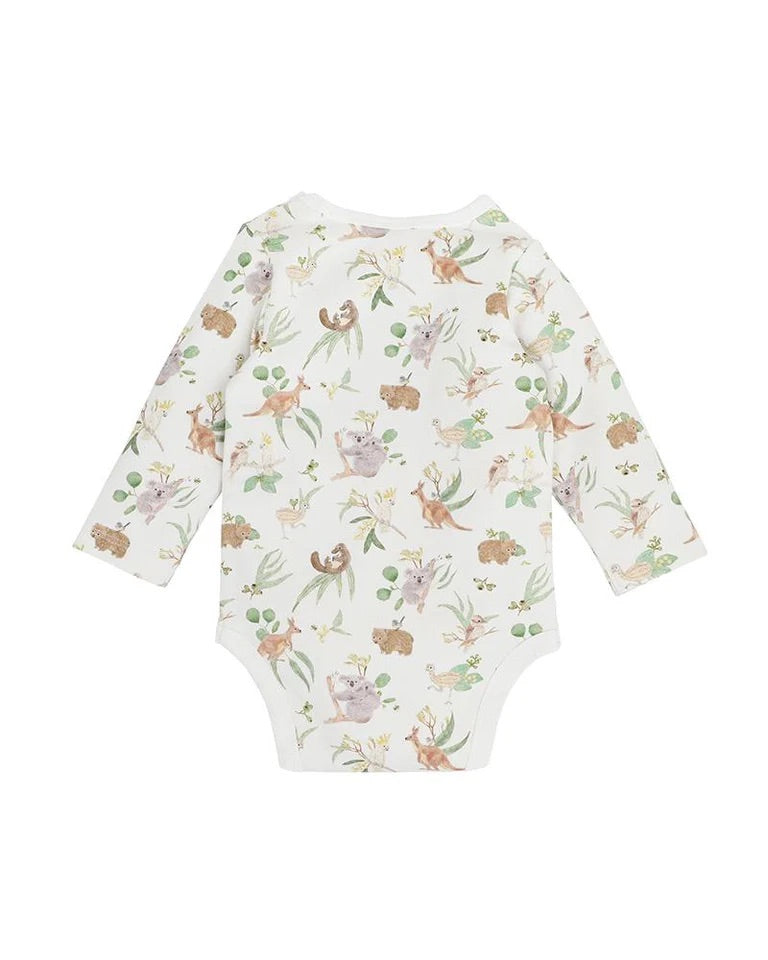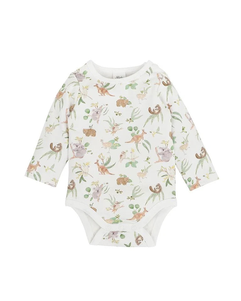This 100% organic cotton interlock knit bodysuit features an Australian native print with contrast neck and leg binding, long sleeves, a concealed press stud shoulder opening and crotch press stud opening for ease of dressing and nappy changes and is a great cute basic for your little one's Winter wardrobe.