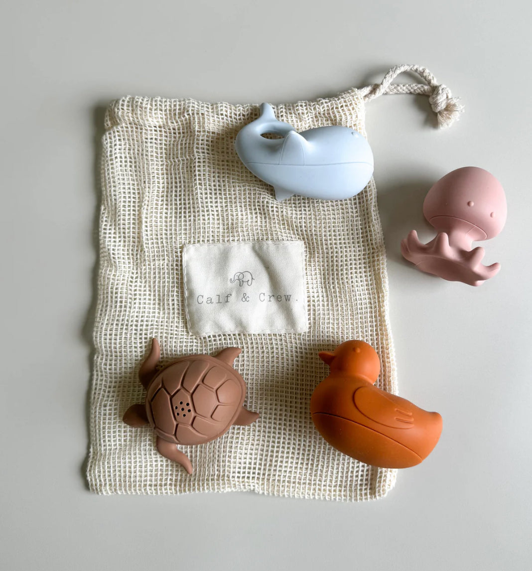 Dive into Adventure! Spark your child's imagination with our new bath play set featuring your childs favourite sea creatures. These bath toys inspire children to engage their imaginations while unknowingly developing their fine motor skills by squeezing and separating them. This soft material is easy for small hands to grip, whether wet or dry.