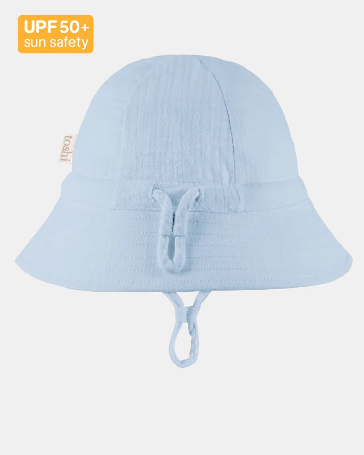 Toshi Bell Hat Sammy is crafted from the finest quality certified 100% organic cotton yarn. Toshi Bell Hat Sammy is a flattering bell shaped hat. The cheesecloth fabrication features a supremely soft and gently nurturing texture. The UPF 50+ UV rating indicates maximum sun protection. A head tie with soft cotton toggle creates adjustable sizing. The chinstrap with soft cotton toggle secures the hat and offers ease of wear. The security release clasp on the chin tie is designed to enhance wearer safety. The sunhat is fully lined for increased comfort.
