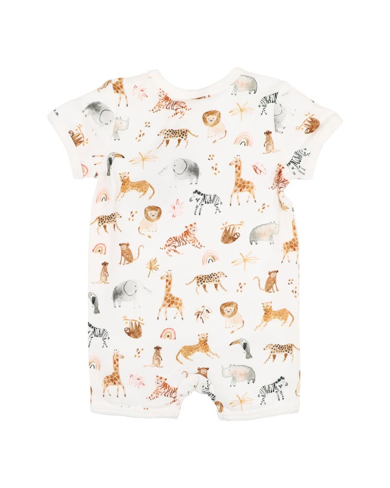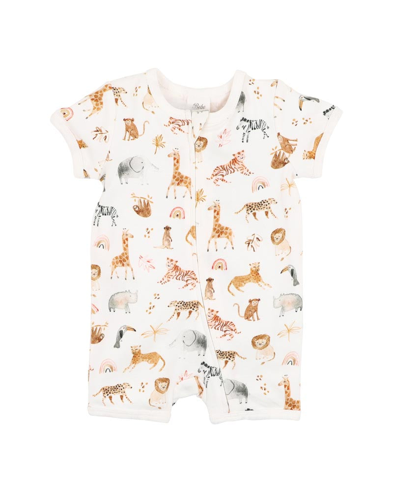 Take a walk on the wild side with our Organic Cotton Short Sleeve Romper in the enchanting Safari animal print. Crafted from soft, breathable organic cotton jersey, this romper is as comfy as it is playful—perfect for everyday adventures, nap time or tummy time. The whimsical safari-inspired print brings lions, giraffes, zebras and more to life in a palette of warm desert tones. With an easy zip front opening for fuss-free changes, this romper makes getting dressed a breeze.