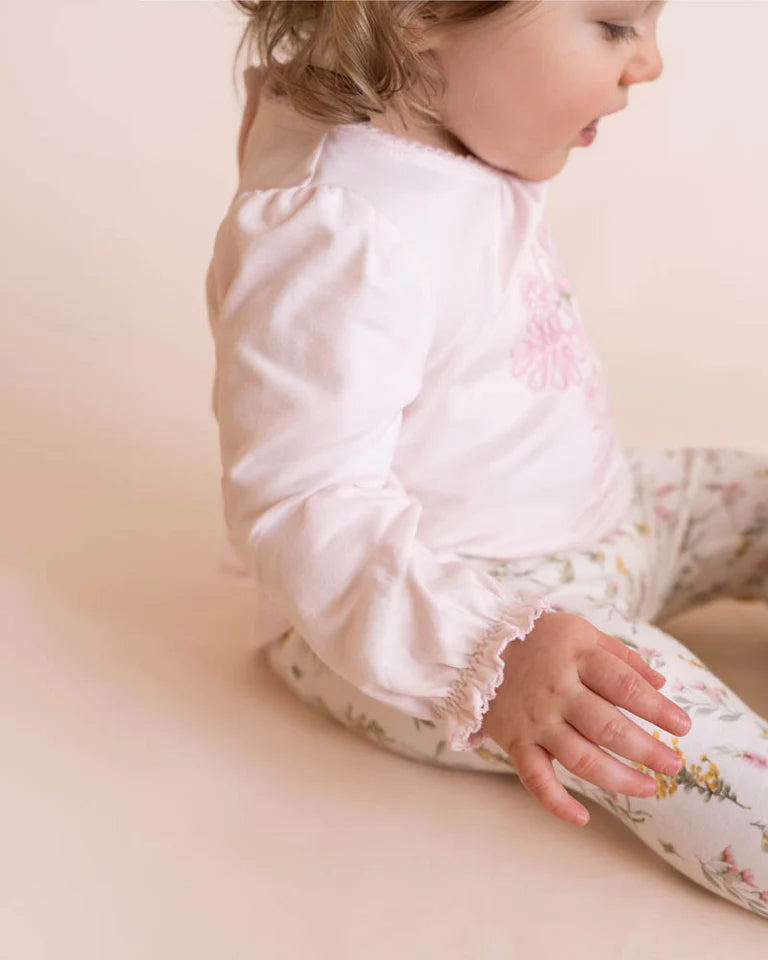 A sweet everyday organic blend tee with a soft gathered neckline and gently puffed sleeves, finished with elasticated frill cuffs for a pretty touch. The embroidered cockatoo graphic surrounded by floral detailing in a gentle blush palette adds a little Australiana charm to this comfy staple. Perfect for layering with our Charlie wattle leggings, it's an easy wardrobe staple for cooler days.