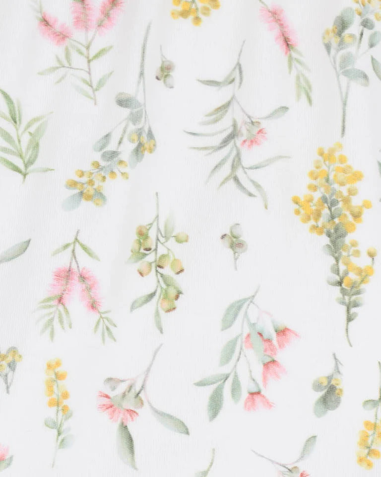 Soft, sweet and thoughtfully designed for those precious early days, this beautifully illustrated zip suit wraps little ones in comfort from cuddle to cot. Featuring our delicate wattle floral print, it's finished with gentle frill details and picot trim for a timeless, heirloom feel. Designed to make changes easy while keeping baby cosy and snug, it's a lovely everyday essential with a touch of something special.