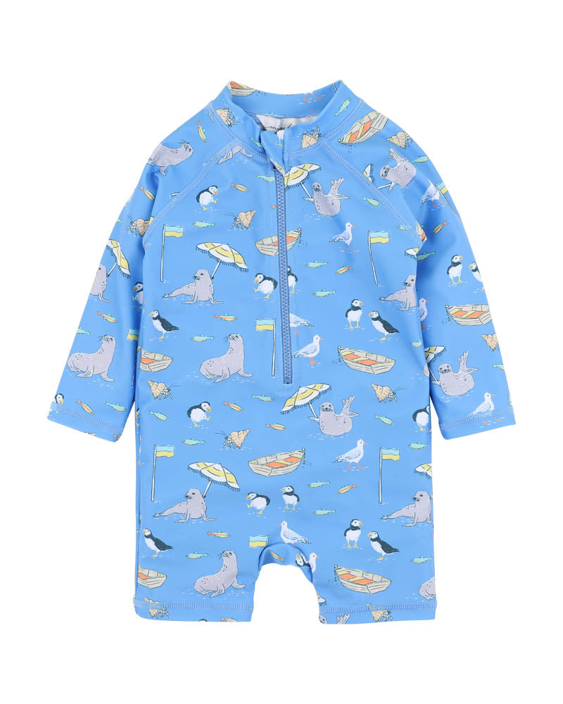 A playful print and a practical design make this long sleeve surf suit perfect for little adventurers who love to splash and explore. With full-length sleeves for added sun protection and a centre front zip for easy changes, this cheerful suit is ready for a day at the beach or poolside fun.