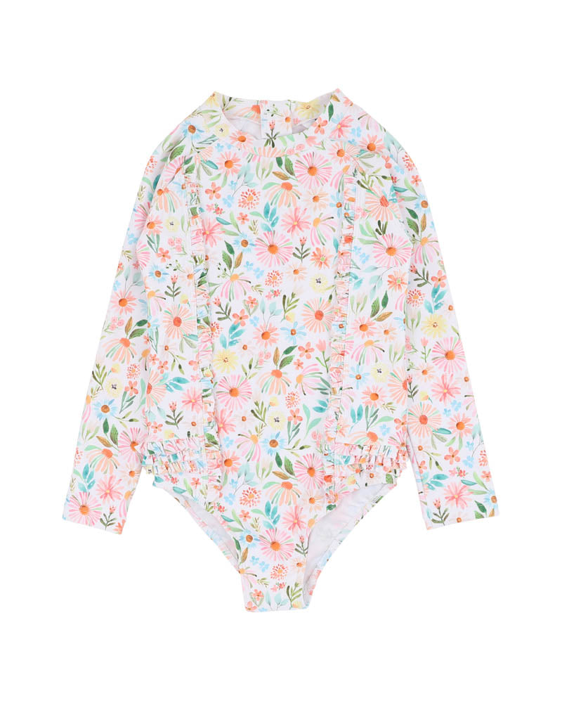 A sweet splash of sunshine! This long-sleeve swimsuit is bursting with cheerful floral blooms and pretty frill detail, perfect for days spent under the sun and in the waves. Designed for comfort and style, it’s ideal for little swimmers who love to stand out while staying sun-safe.