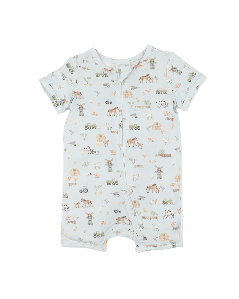 Bring a little countryside charm to your baby's wardrobe with this sweet farmyard short sleeve zip romper. Featuring a delightful print of animals, tractors and barns, it captures the magic of farm life in the softest EcoCosy™ viscose blend. Gentle on delicate skin and designed to move with your baby, it’s perfect for playtime or those lazy afternoon naps. The full-length zip makes changes quick and fuss-free, with a protective safety fold at the neck for extra comfort.