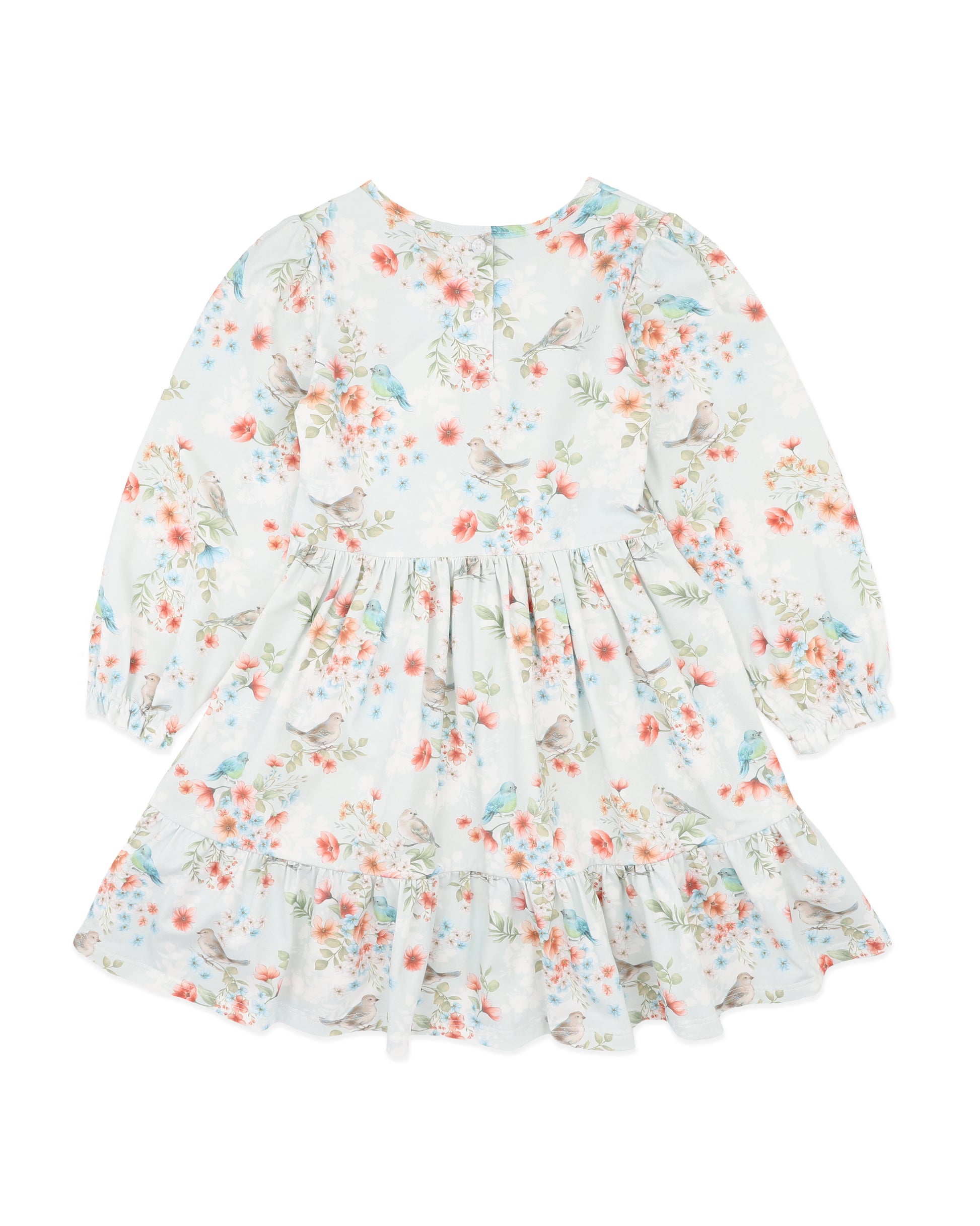 A sweet everyday dress designed for little moments and special memories alike. Crafted from soft organic cotton jersey, this charming style features our delicate bird and floral print, with gentle gathers and a tiered skirt that moves beautifully with every step. Thoughtful details like picot trims and softly frilled cuffs add a pretty finishing touch, while the relaxed silhouette keeps her comfortable from playtime through to afternoon outings.