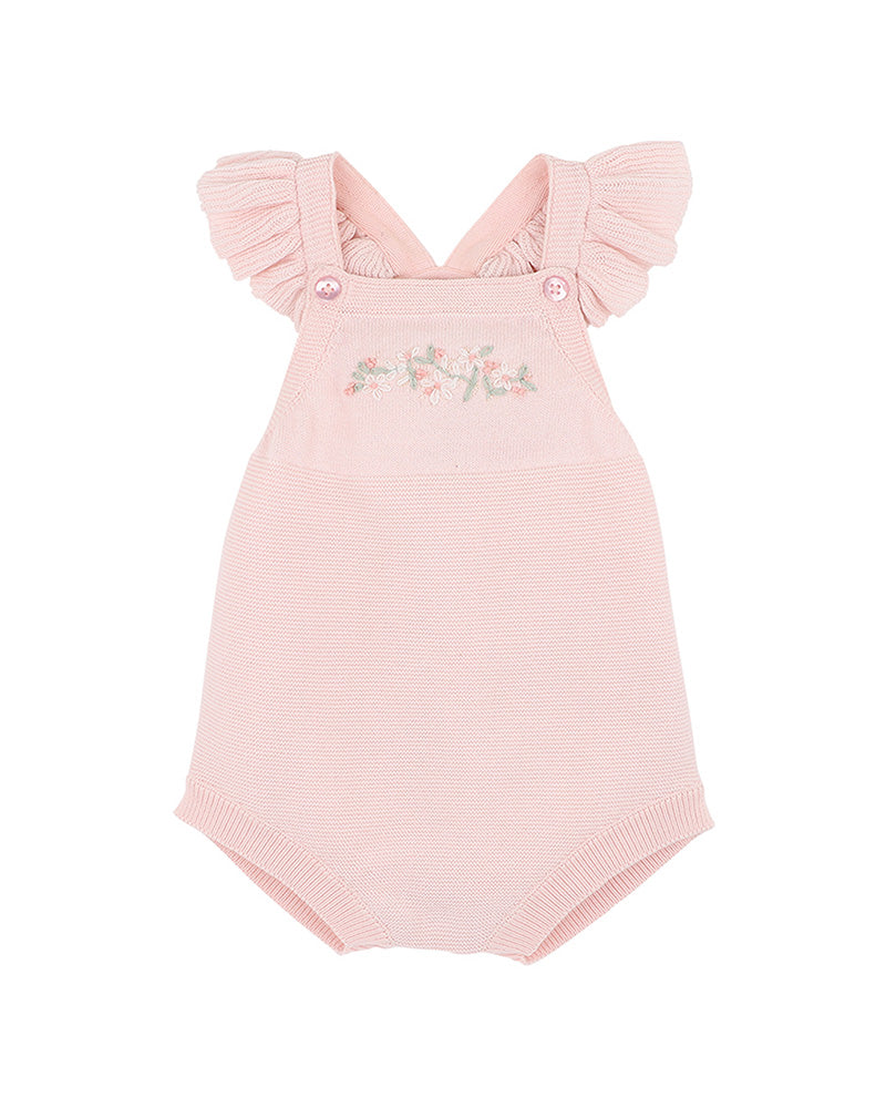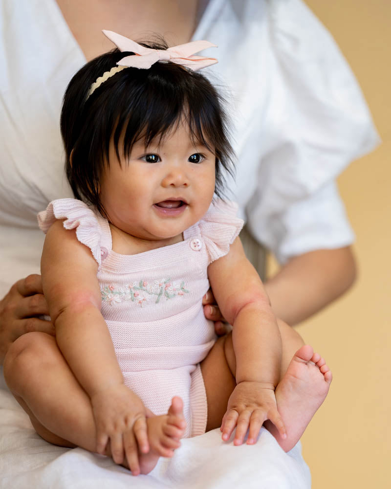 A sweet summer staple with vintage charm, this knitted romper is made for sunshine days and picture-perfect moments. Featuring fluttery shoulder frills and delicate hand embroidery across the chest, it’s a beautifully crafted piece designed for comfort, style, and a touch of whimsy. Perfect for special outings or sunny playdates, layered with a bodysuit or worn on its own.