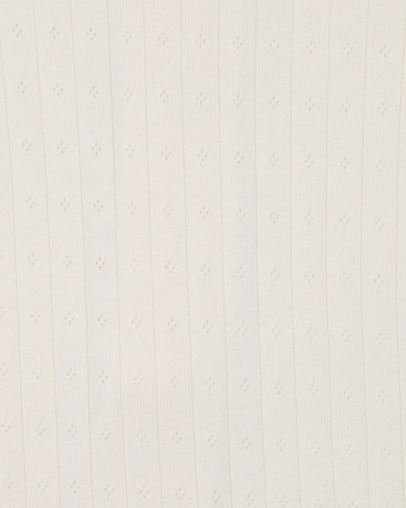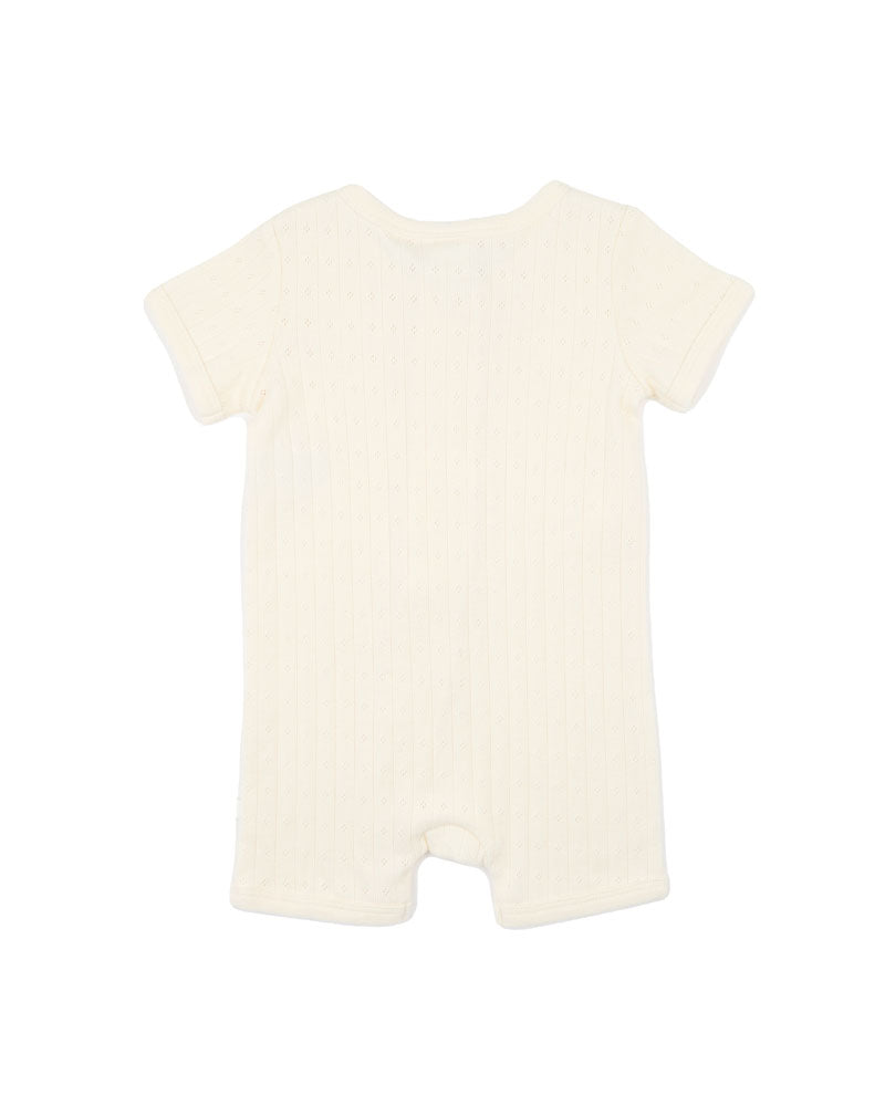 This sweet milk short sleeve grow suit is a warm-weather essential for little ones. Crafted from breathable organic cotton pointelle with a pretty eyelet texture, it’s soft and lightweight for everyday play. A full-length zip with a protective neck fold makes changes quick and easy, and the short legs are perfect for summer days.