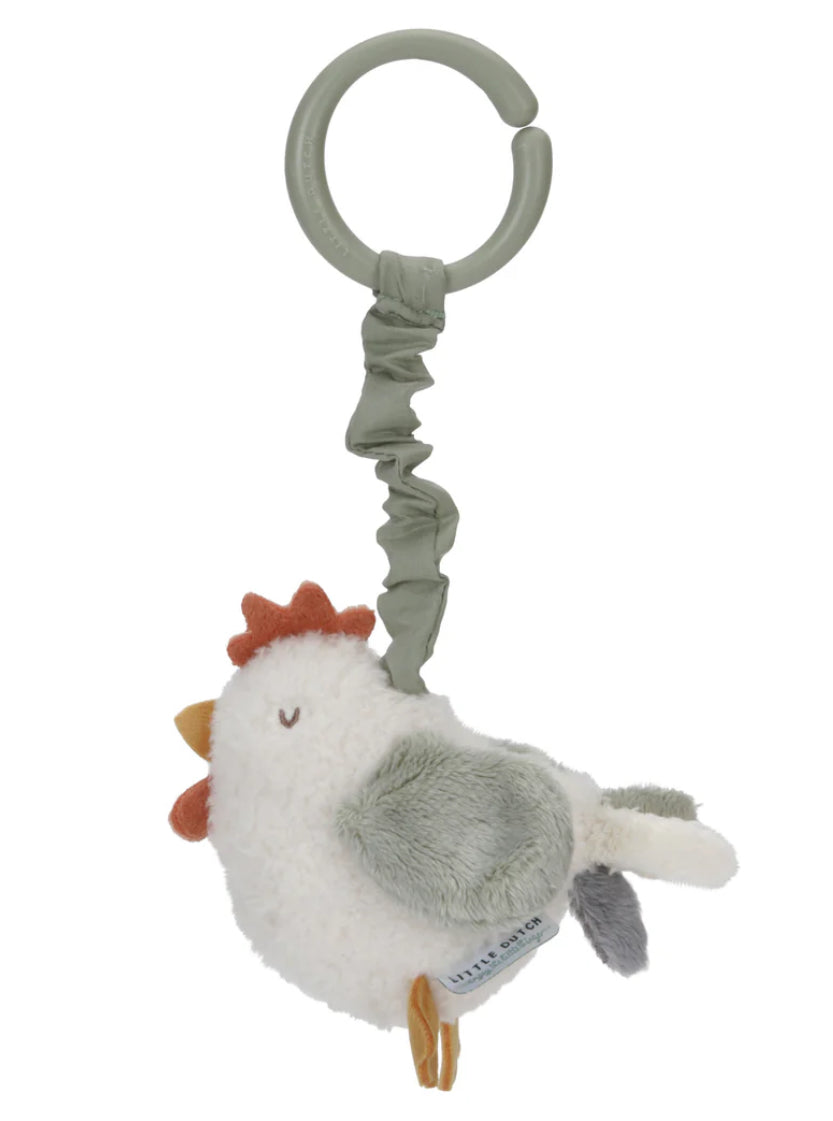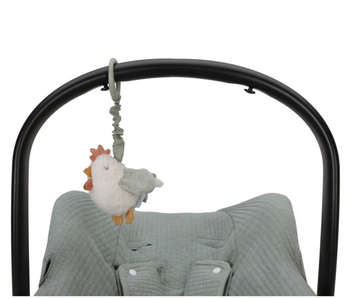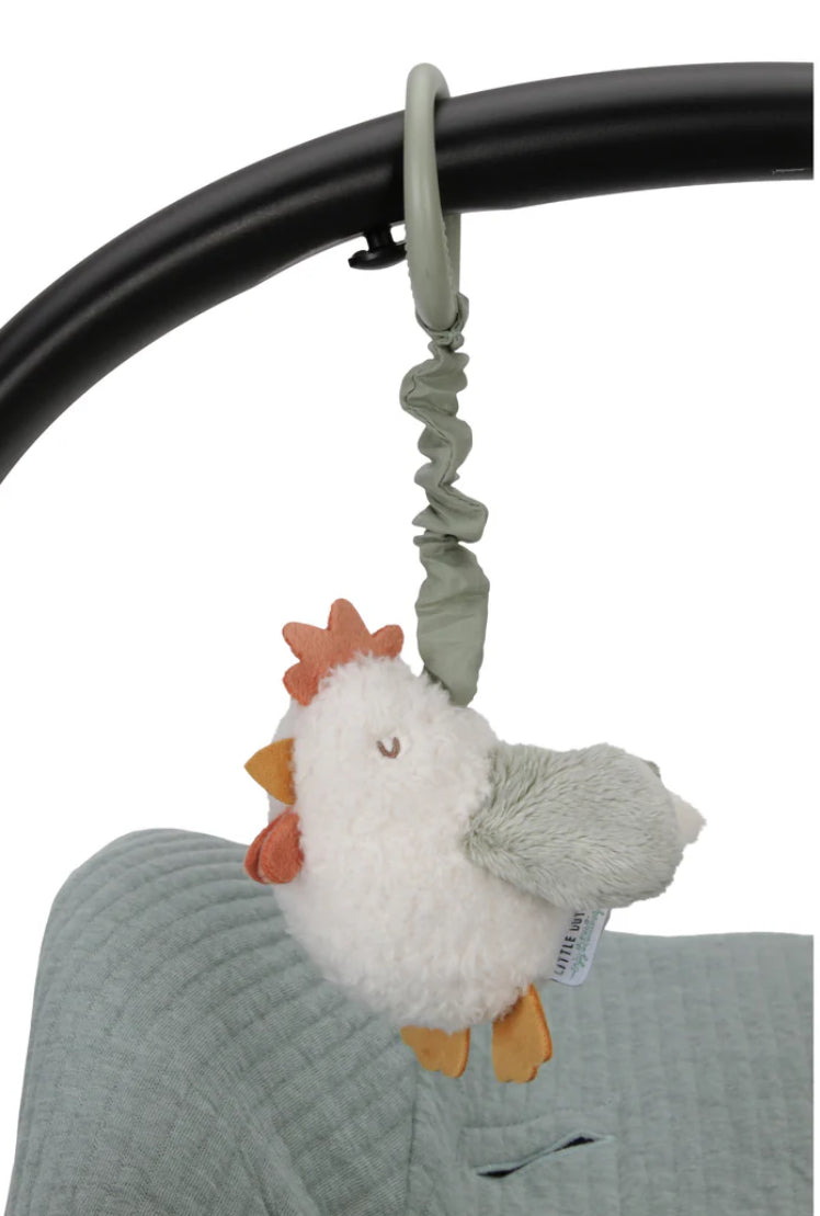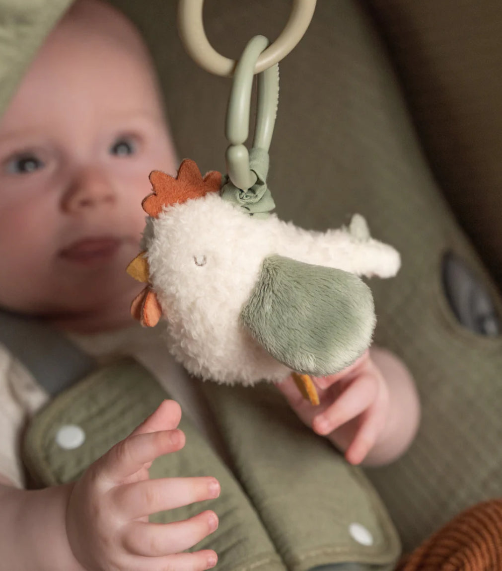 Move around! This cheerful little chicken is designed with playful textures. If you pull on her, she starts to vibrate. You can easily attach this fun toy to a car seat, a playpen or a stroller. Made for little hands to grab, it provides endless entertainment at home and on the go. Laughter and giggles guaranteed.