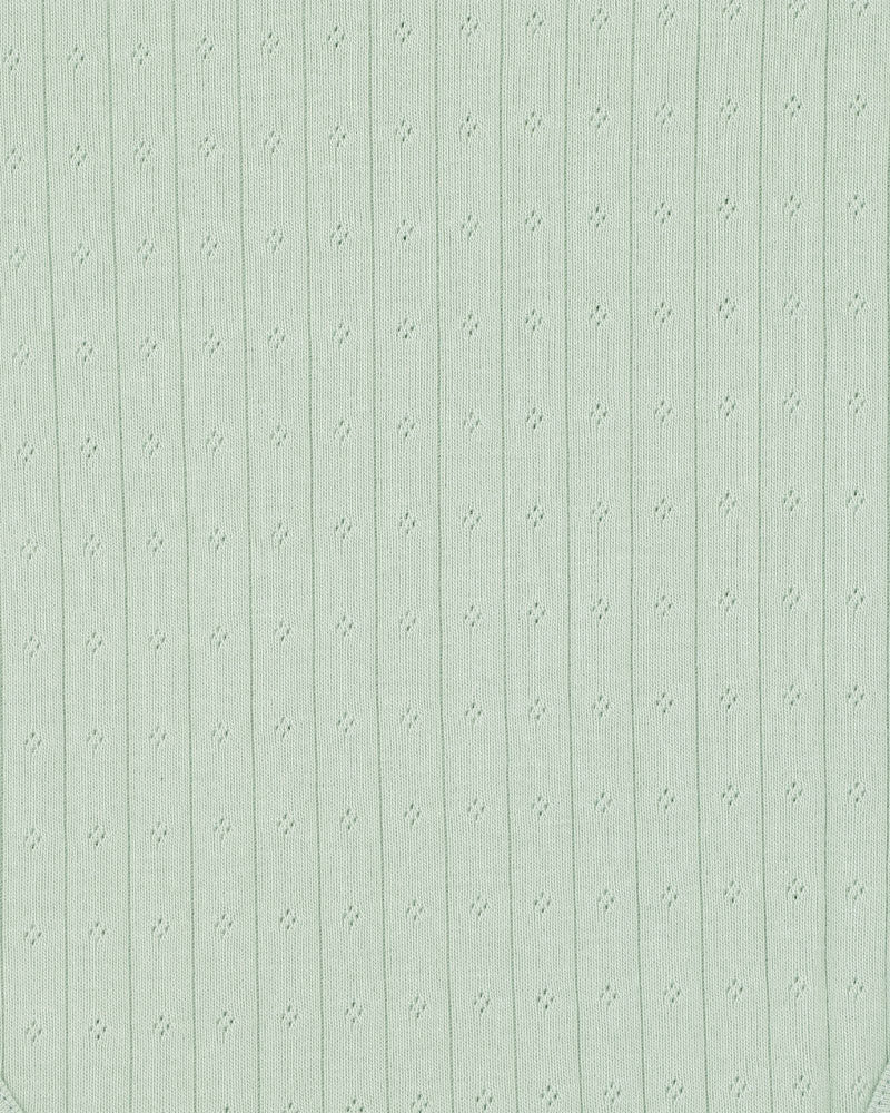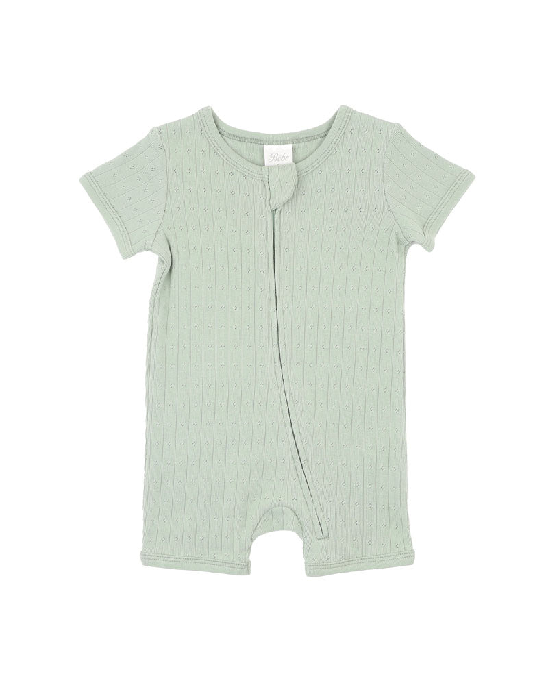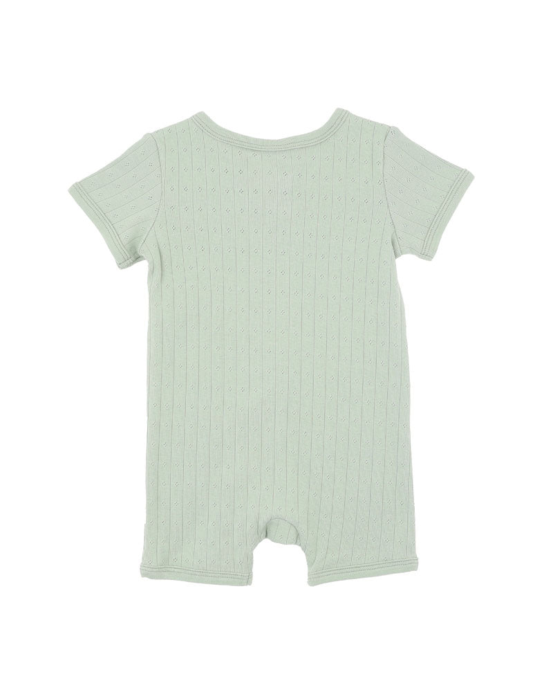 This sweet sage short sleeve grow suit is a warm-weather essential for little ones. Crafted from breathable organic cotton pointelle with a pretty eyelet texture, it’s soft and lightweight for everyday play. A full-length zip with a protective neck fold makes changes quick and easy, and the short legs are perfect for summer days.