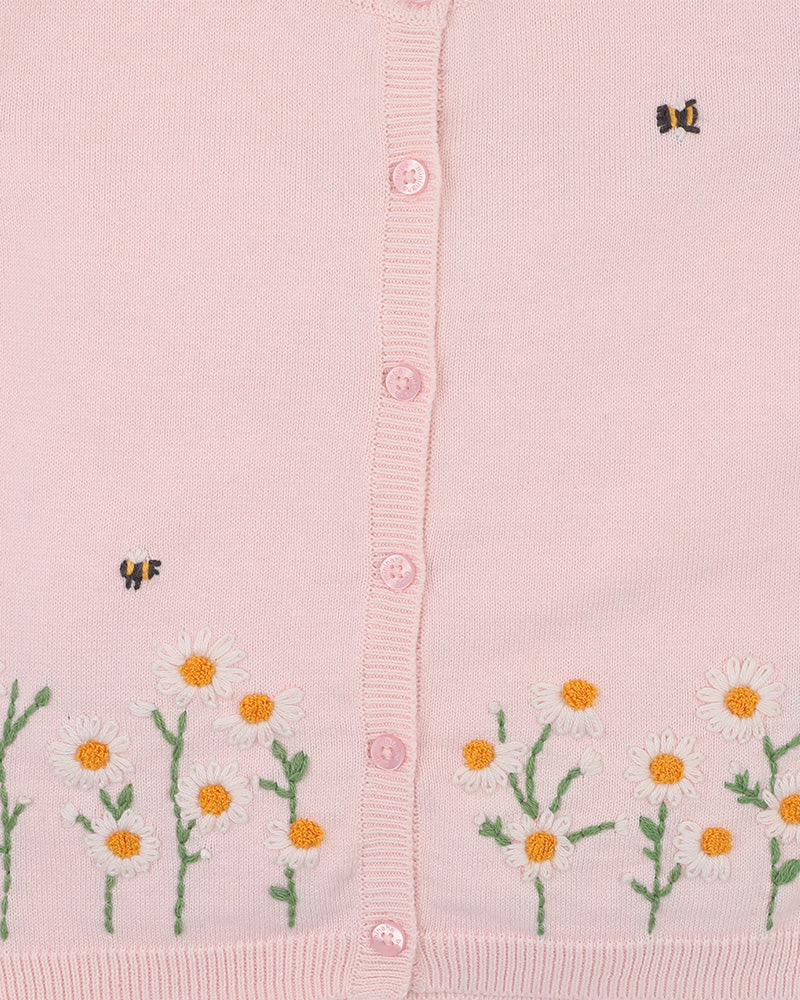 A sweet layering piece for cooler days, our hand-embroidered cardigan is sprinkled with delicate daisies and buzzing bees—bringing a garden full of charm to any outfit. Made from beautifully soft Organic Cotton, it’s gentle on delicate skin and perfect for transeasonal wear. Pair it with any outfit for everyday whimsy. Available in baby and big girl sizes for sibling twinning moments.